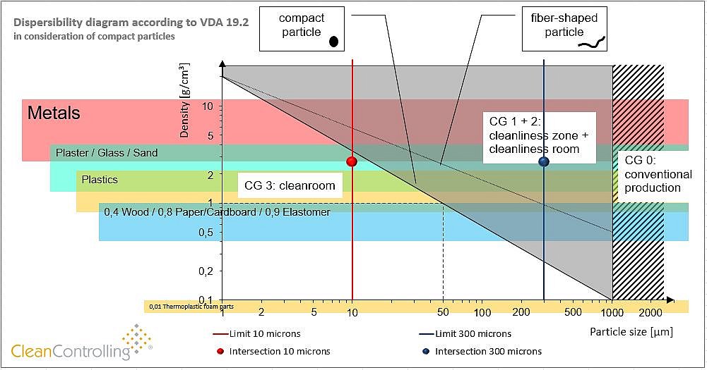 If only compact particles are considered, i.e. without fibers and lint, the design point is at the intersection of the cleanroom and cleanroom. If fibrous particles were neglected, the planning of the production environment would have to be based on cleanliness level 2 (cleanroom) and the detailed design would have to take into account the recommendations of the VDA guideline for SaS2 (cleanroom), whereby elements of SaS3 (cleanroom) would have to be included.