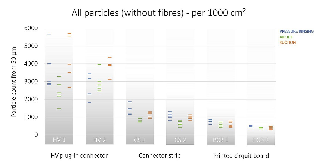 To investigate the effectiveness of these three extraction methods, a comprehensive study with a large-scale test series with various electrical and electronic assemblies was carried out in 2021 by a working group of the ZVEI e.V. (German Electrical and Electronic Manufacturers' Association). Several components of HV connectors, connector strips and printed circuit boards were taken from the same production batches and tested and analyzed using these three extraction methods. The focus here was on the total number of particles from several individual analyses and the scattering width between them.