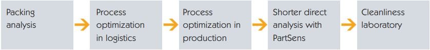 The determination of particle contamination resulting mainly from the manufacturing process is carried out by indirect testing. Before microscopic evaluation by measuring, counting and typing the particles, they are extracted from the component in a sampling step. This extraction is carried out with a liquid or dry medium.
