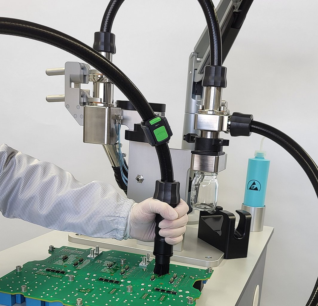 With the digital control, the system is particularly suitable for repetitive tests, e.g. in-line tests during series production in the process environment or in the laboratory. Several component-specific test parameters can be saved, which then guide the user through the test process with voice prompts and on-screen display. Monitoring of the test parameters also includes fully integrated monitoring of the volume flow during suction extraction.