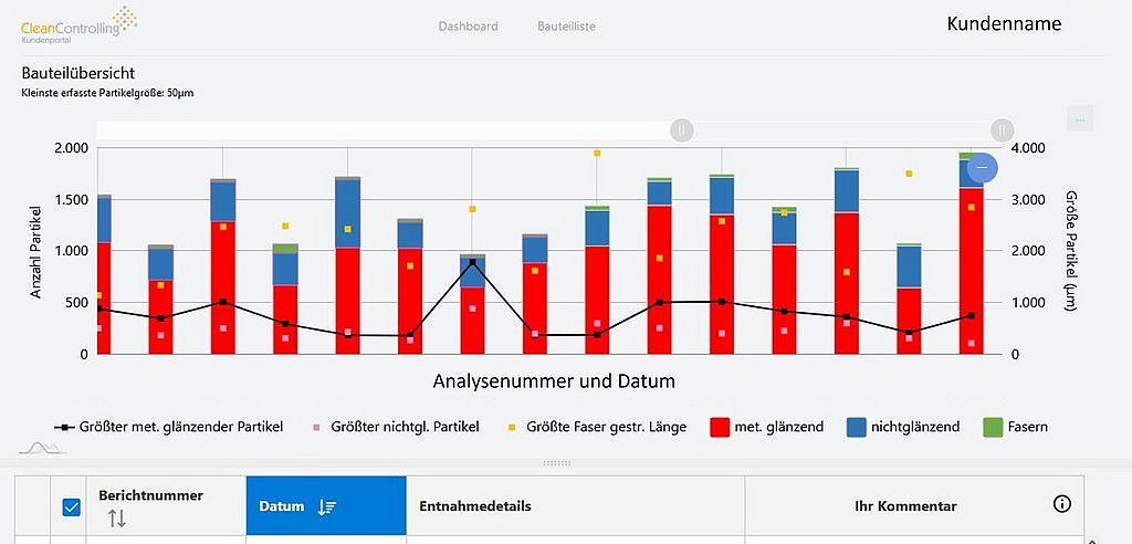 Mit dem neuen Kundenportal hat CleanControlling ein zukunftsorientiertes Tool entwickelt, das einen umfassenden und grafisch optimal aufbereiteten Zugriff auf Analysedaten bietet. Sämtliche Bauteile, für die Sauberkeitsprüfungen durchgeführt werden, sind als Foto im Kachelformat dargestellt und einzeln abrufbar. Ein Klick auf die Darstellung reicht aus, damit alle Analysen und Auswertungen zum jeweiligen Werkstück standortübergreifend angezeigt werden – inklusive der Historie – wobei einzelne Analysen ein- und ausgeblendet werden können. Die übersichtliche numerische Aufbereitung der Daten und Diagramme sowie Fotos der ermittelten Partikel, sortiert nach Größe und Art (metallisch, nicht metallisch und Fasern) sorgen für einen sehr anschaulichen, verständlichen und schnellen Überblick.