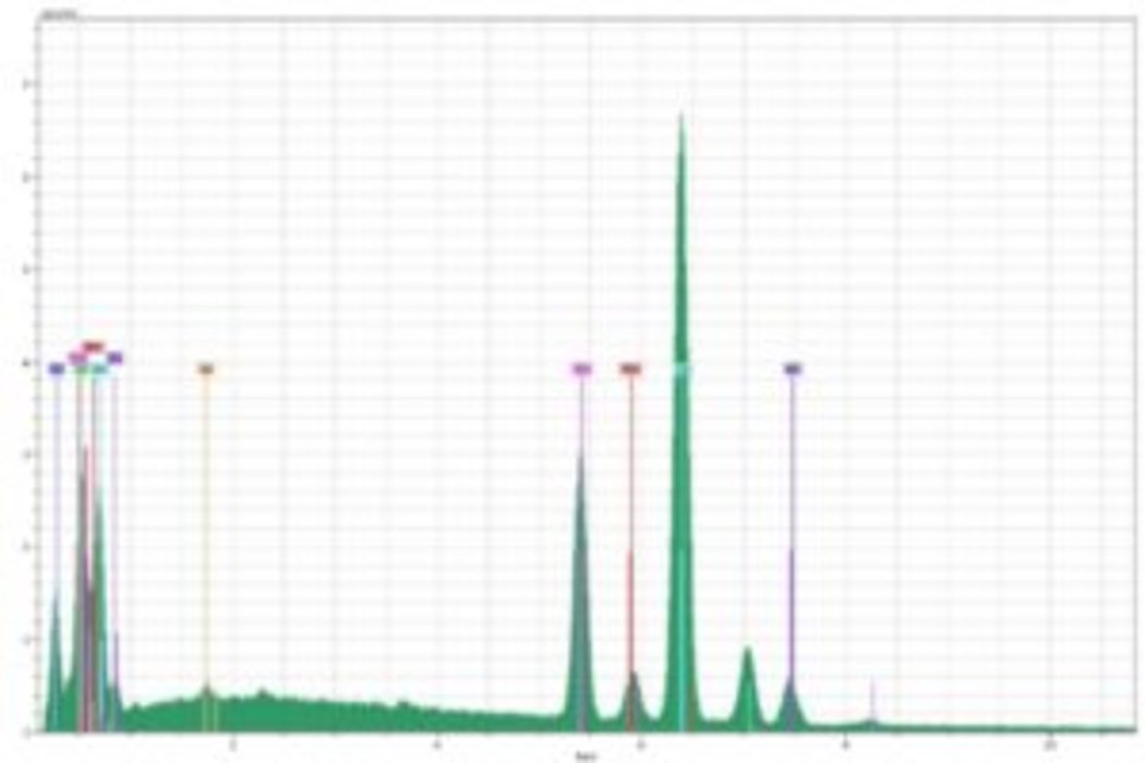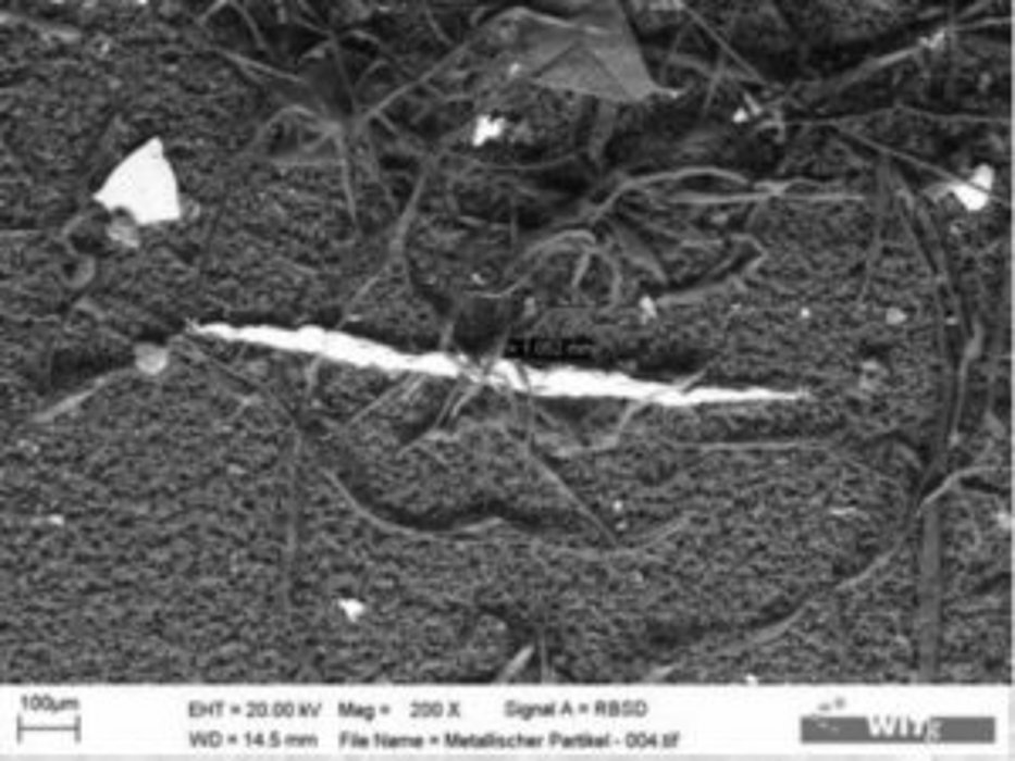 metallischer Partikel besteht aus Eisen, Chrom, Nickel, Mangan und Silizium (rostfreier Stahl) und Sauerstoff mit Beimengungen von Kohlenstoff
